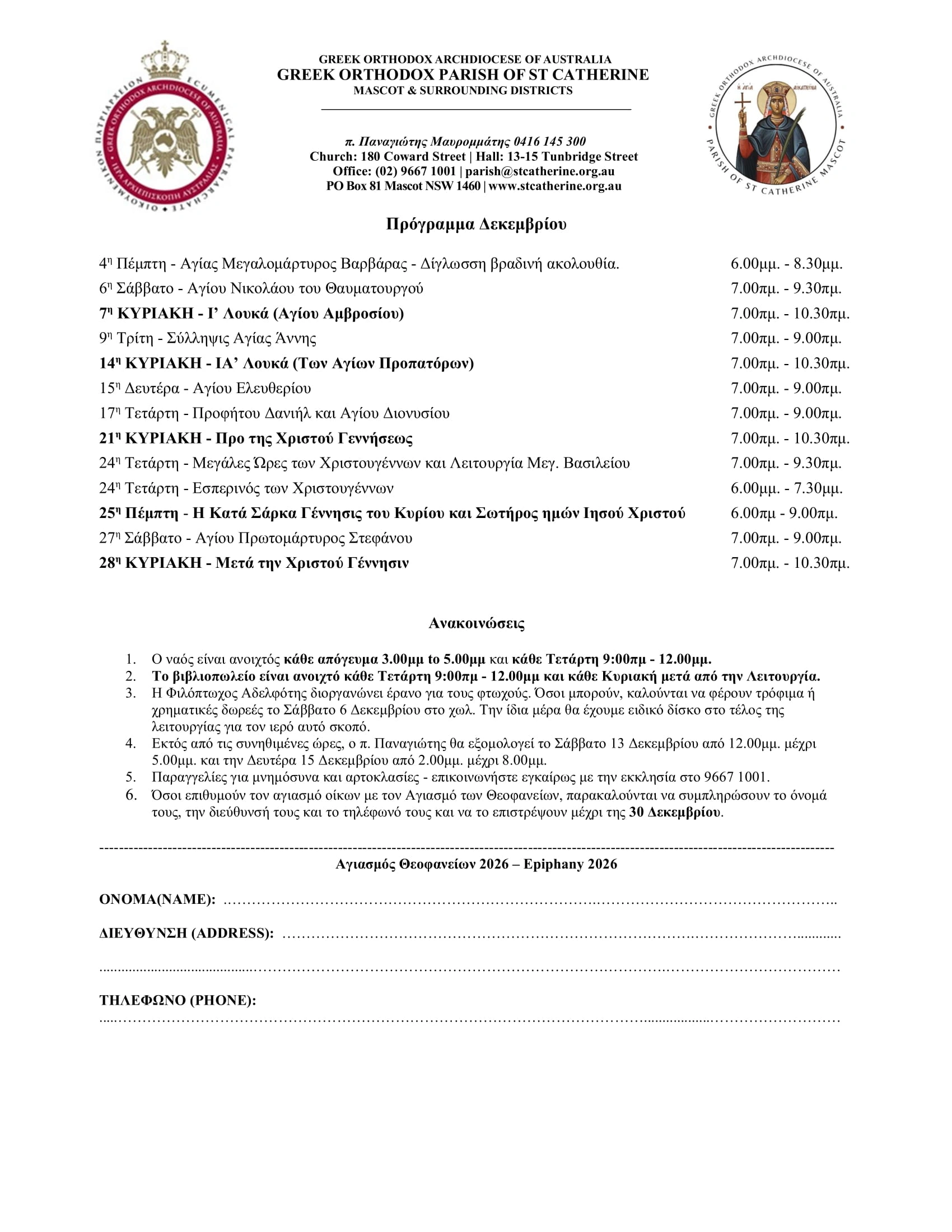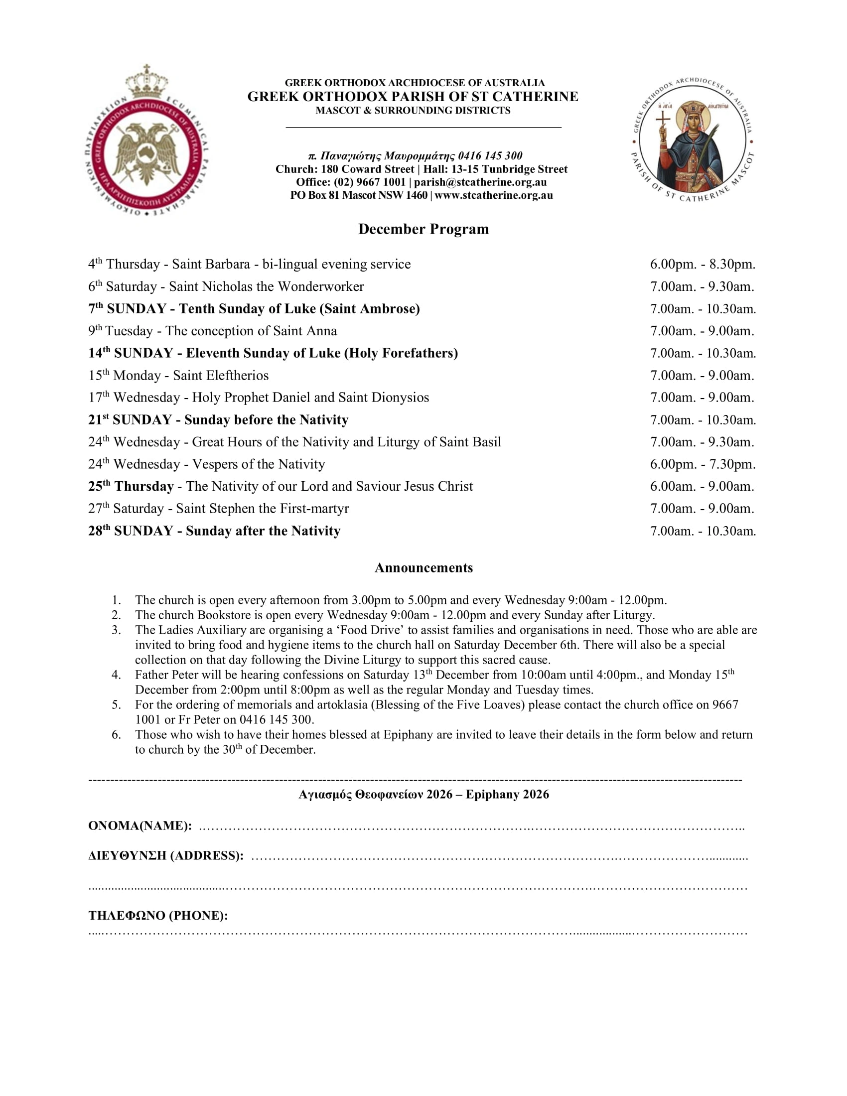 Saint Catherine's is a dynamic parish of the Greek Orthodox Archdiocese of Australia, serving the spiritual and liturgical needs of the faithful of Mascot and the surrounding districts.